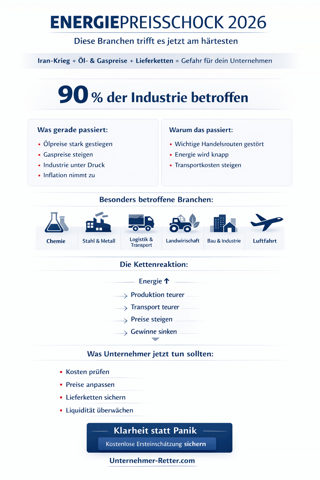 Die folgenden Branchen sind nicht „gleich stark“ betroffen. Entscheidend ist, ob Energie (a) wesentlicher Kostenfaktor, (b) Teil des Produktionsprozesses oder (c) kritischer Rohstoff ist – und ob Preiserhöhungen am Markt kurzfristig durchsetzbar sind. [14]