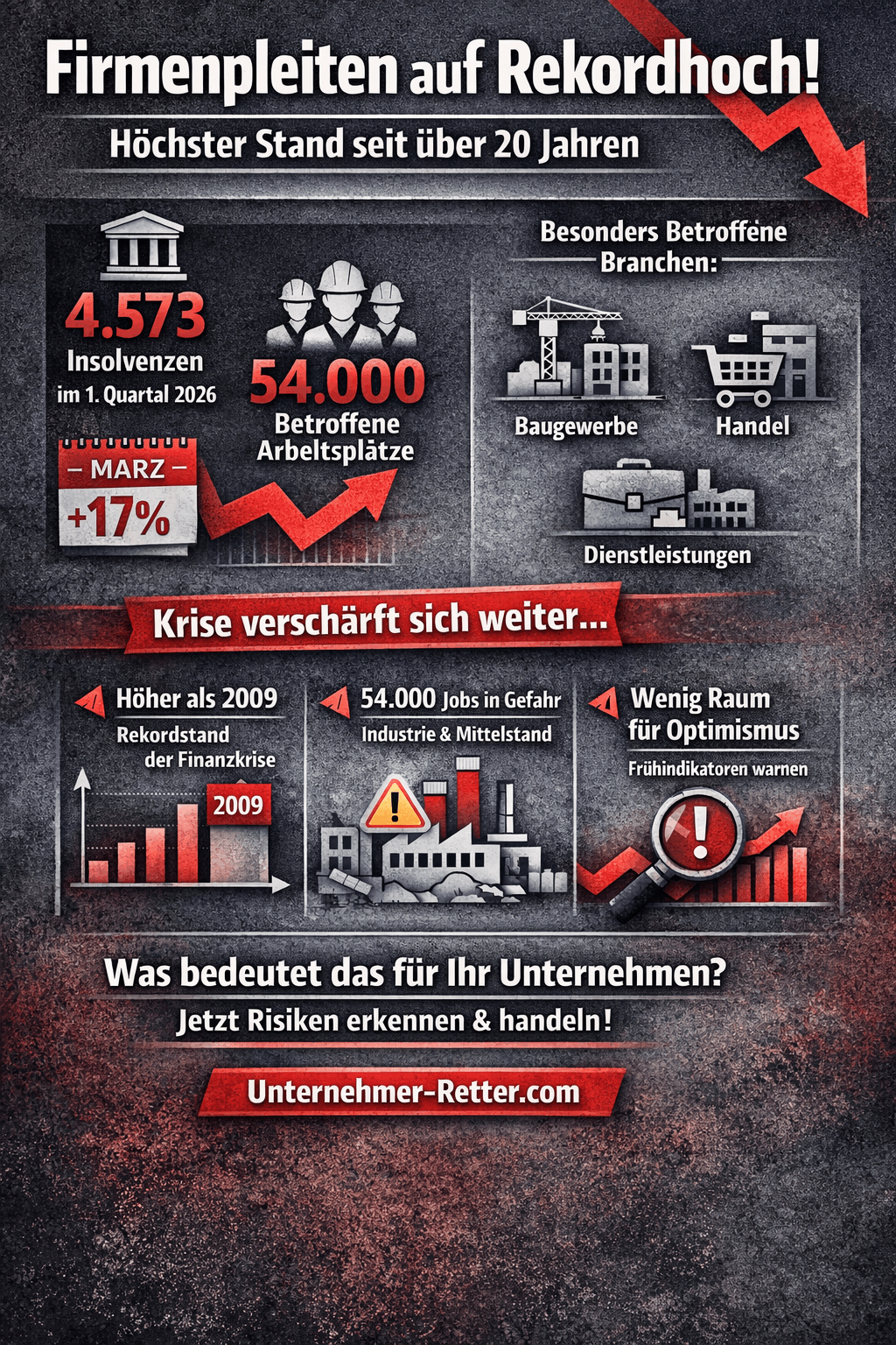 Im ersten Quartal 2026 wurden 4.573 Insolvenzen von Personen- und Kapitalgesellschaften registriert. Damit liegt das Niveau höher als während der Finanzkrise 2009 – und erreicht den höchsten Stand seit dem dritten Quartal 2005.
