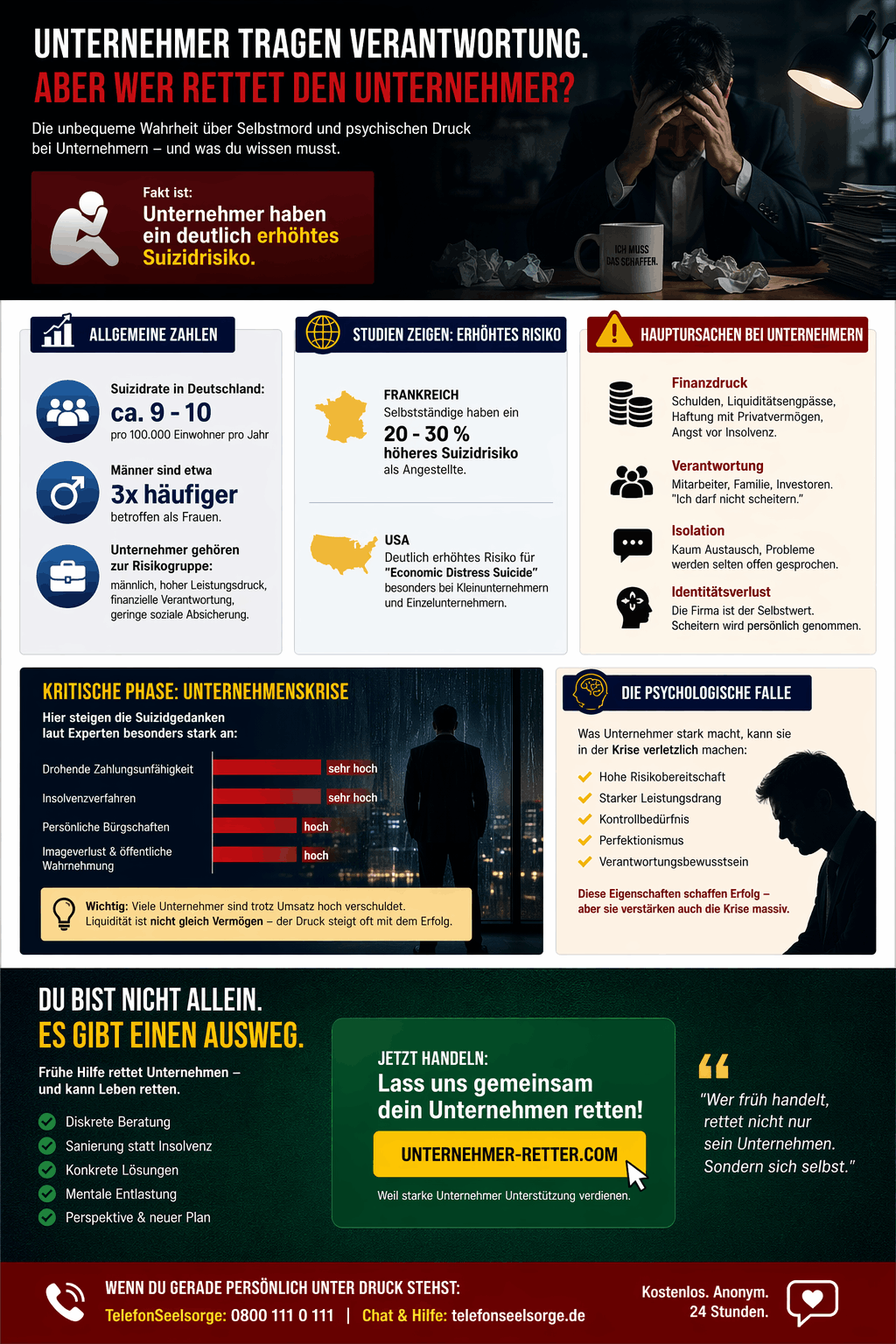 Eine isolierte, offizielle Statistik zur Suizidrate speziell unter Unternehmern in Deutschland existiert nicht. Die oben genannten Quellen zeigen jedoch übereinstimmend: