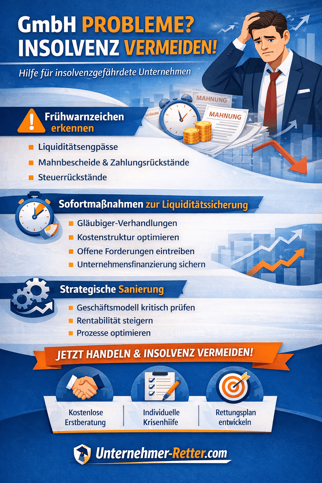Typische GmbH Probleme sind Liquiditätsengpässe, Zahlungsunfähigkeit, Überschuldung, Gesellschafterstreit, Geschäftsführerhaftung, steuerliche Rückstände und operative Fehlentwicklungen. Oft treten mehrere Probleme gleichzeitig auf. Besonders kritisch wird es, wenn eine Insolvenzantragspflicht entsteht oder persönliche Haftungsrisiken für den Geschäftsführer drohen.