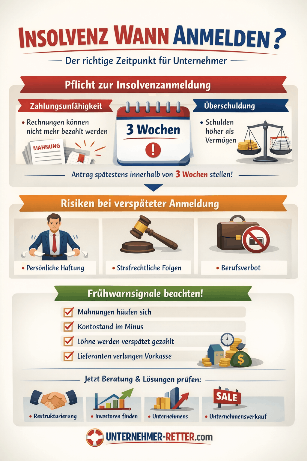 Die Frage „Insolvenz wann anmelden?“ gehört zu den sensibelsten und gleichzeitig wichtigsten Fragen, die sich Unternehmer in einer wirtschaftlichen Krise stellen müssen. Viele Geschäftsführer, Gesellschafter und Selbstständige zögern zu lange – aus Hoffnung, Unwissenheit oder Angst vor Konsequenzen.