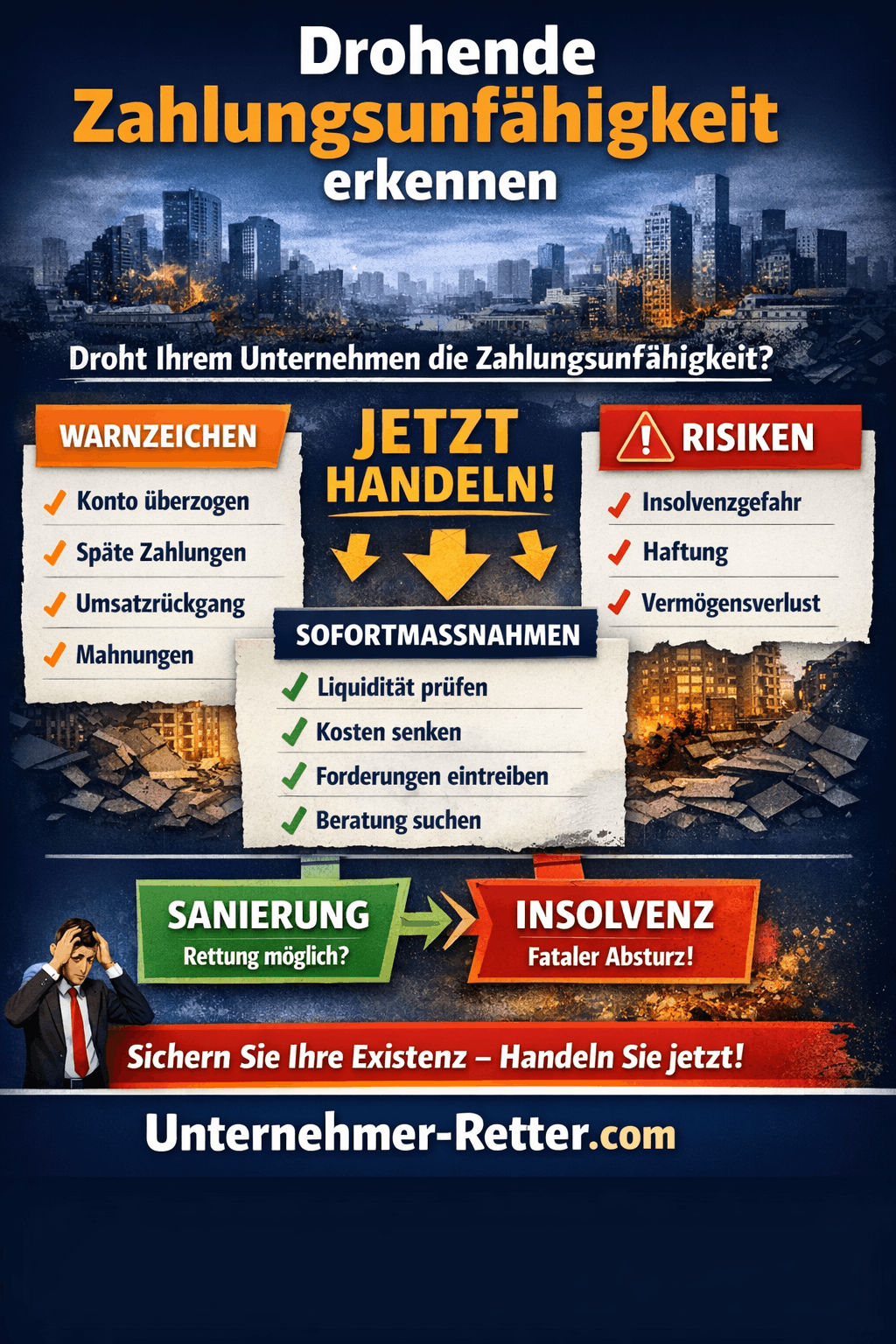 Weil hier noch Handlungsspielraum besteht. Wer diesen Zustand früh erkennt, kann sein Unternehmen retten. Wer ihn übersieht, rutscht oft ungebremst in die Insolvenz – mit persönlicher Haftung, Strafbarkeitsrisiken und massivem Vermögensverlust.