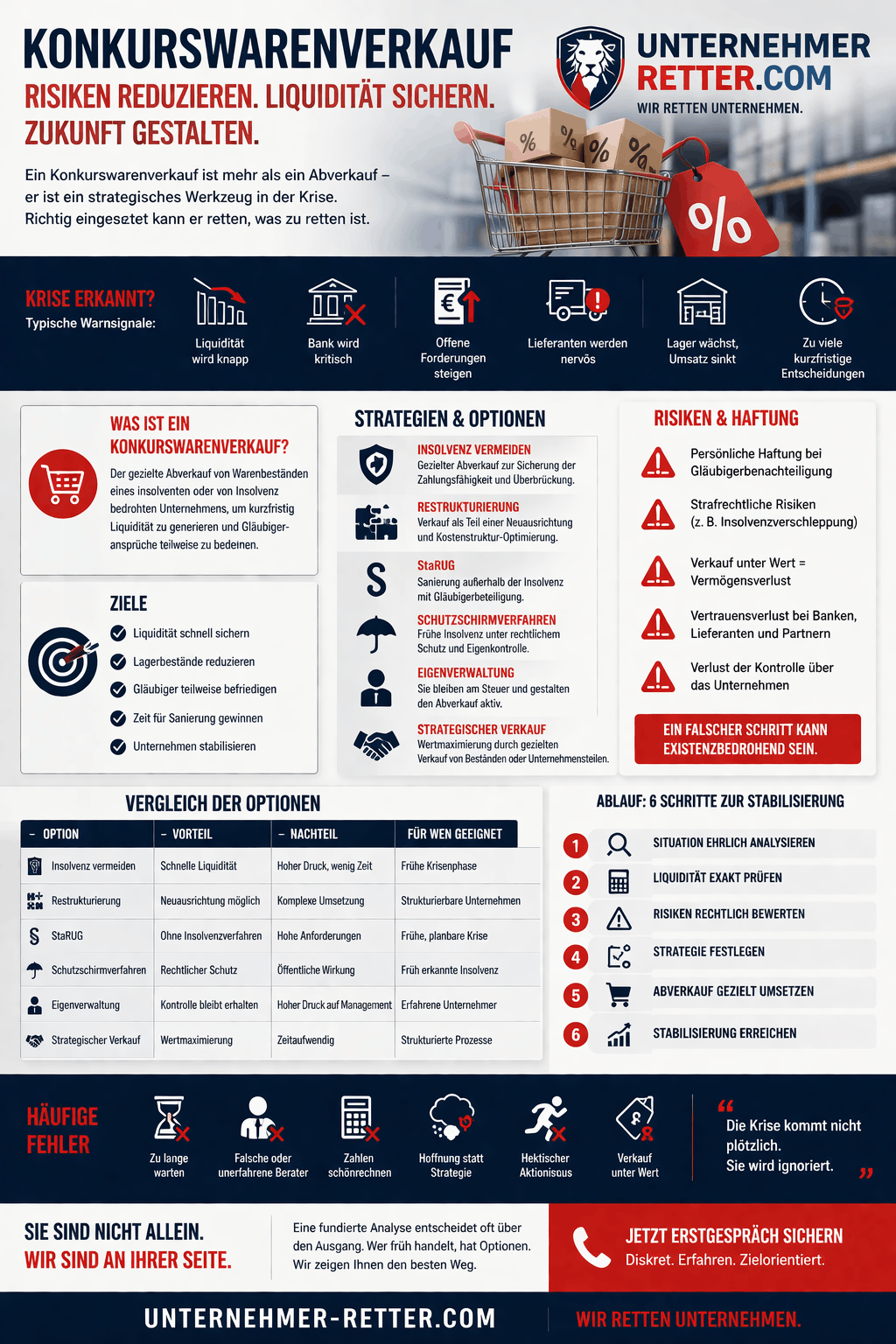 Der Konkurswarenverkauf ist kein Marketinginstrument. Er ist ein Notfallwerkzeug. Wer hier handelt, steht bereits unter massivem wirtschaftlichen Druck.
