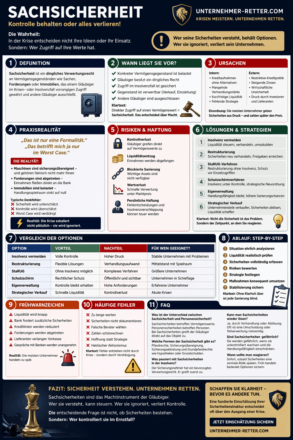 Sobald ein Gläubiger direkten Zugriff auf einen Vermögenswert hat – unabhängig vom restlichen Unternehmen – handelt es sich um eine Sachsicherheit. Und genau das entscheidet über Machtverhältnisse in der Krise.