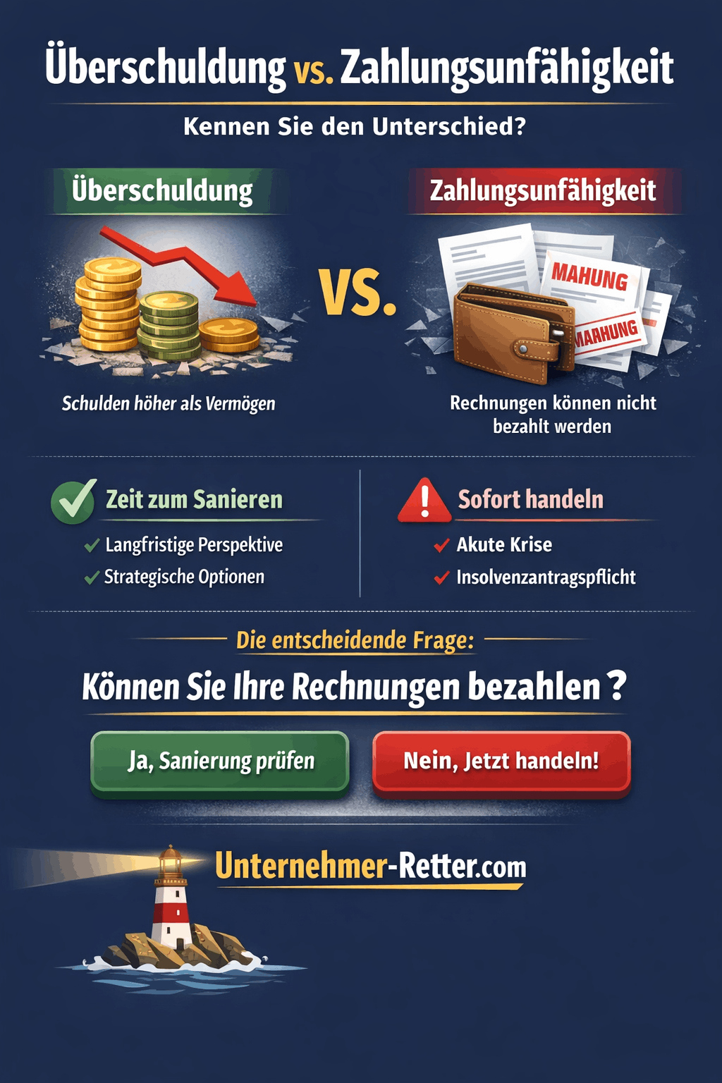 Viele Unternehmer verwenden Überschuldung und Zahlungsunfähigkeit synonym. Das ist einer der häufigsten – und gefährlichsten – Fehler in der Unternehmenskrise.